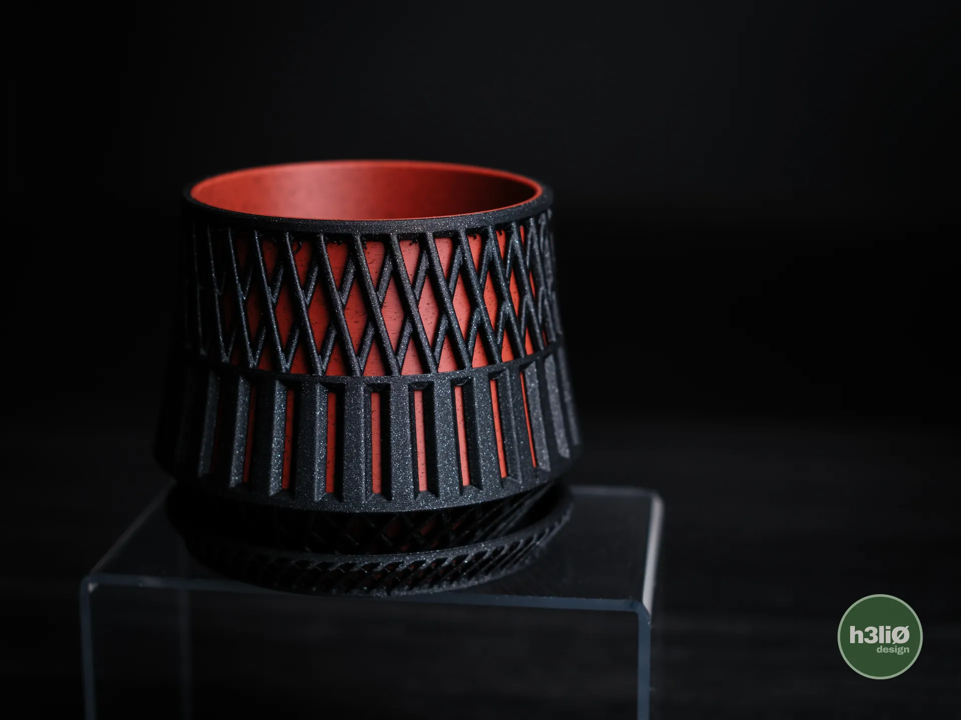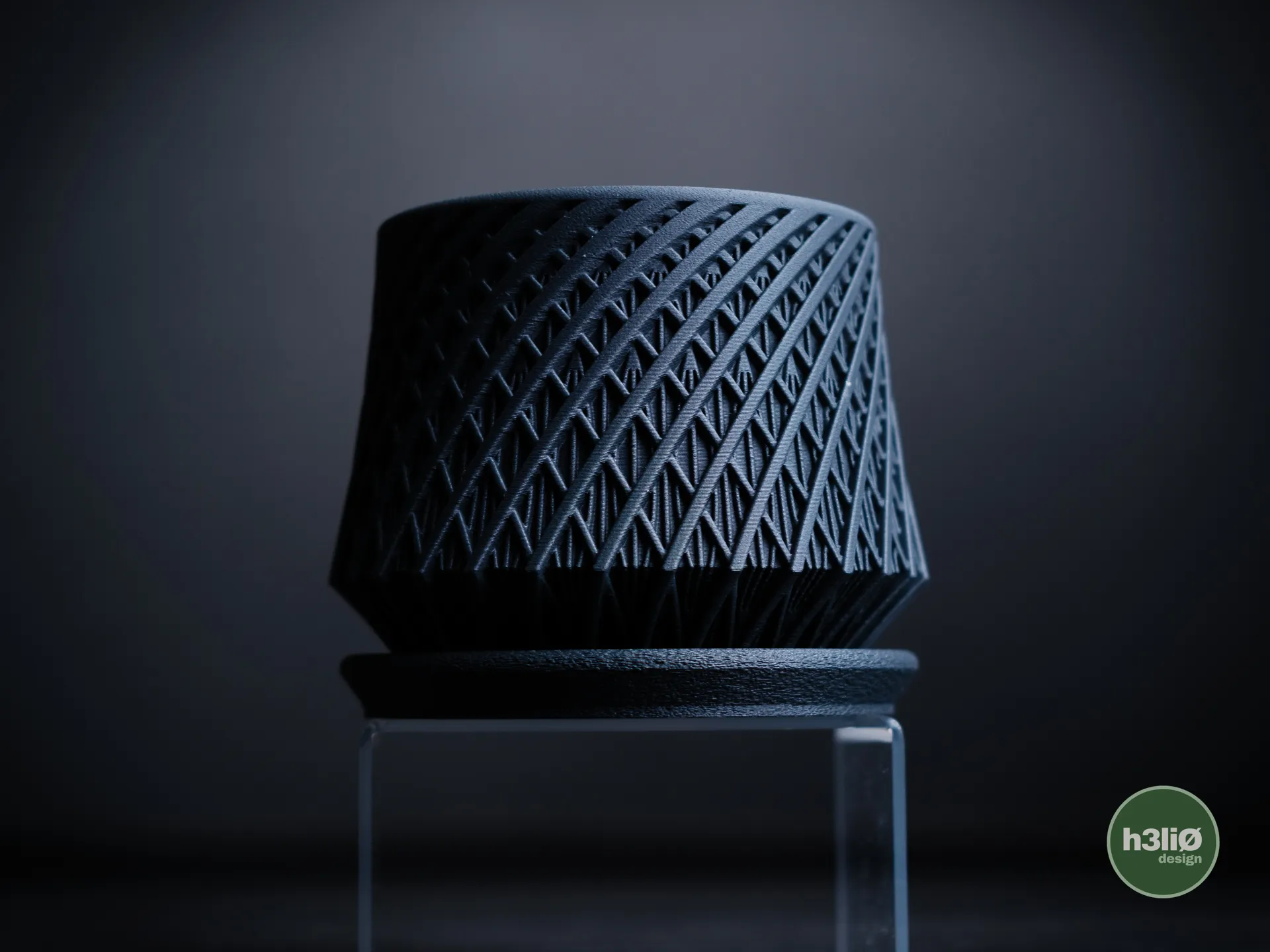 Designerska doniczka 3D z geometrycznym wzorem, stojąca na osobnej podstawce. Dostępna w dwóch wysokościach (80 mm i 100 mm). Idealna do nowoczesnych wnętrz.