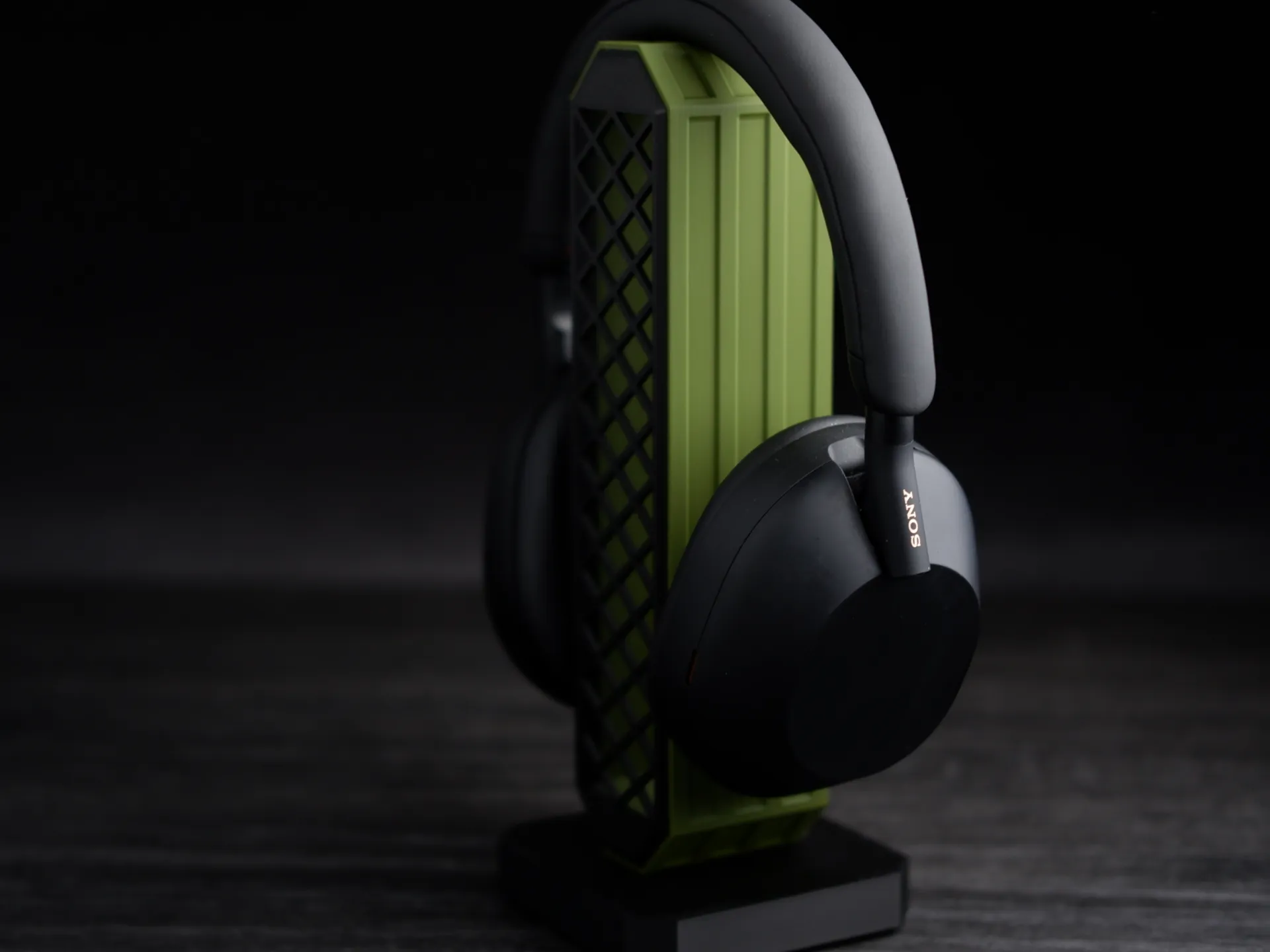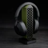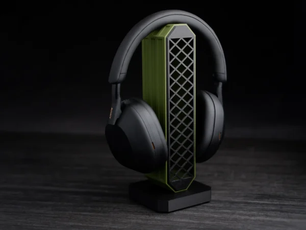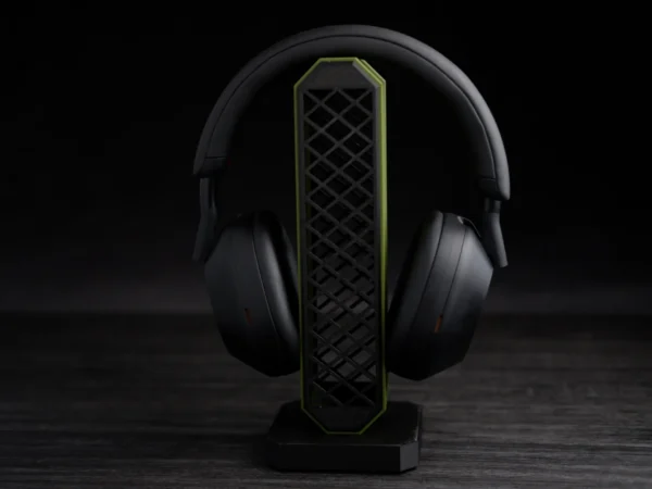 Modułowy stojak na słuchawki o wyrazistej, geometrycznej estetyce.