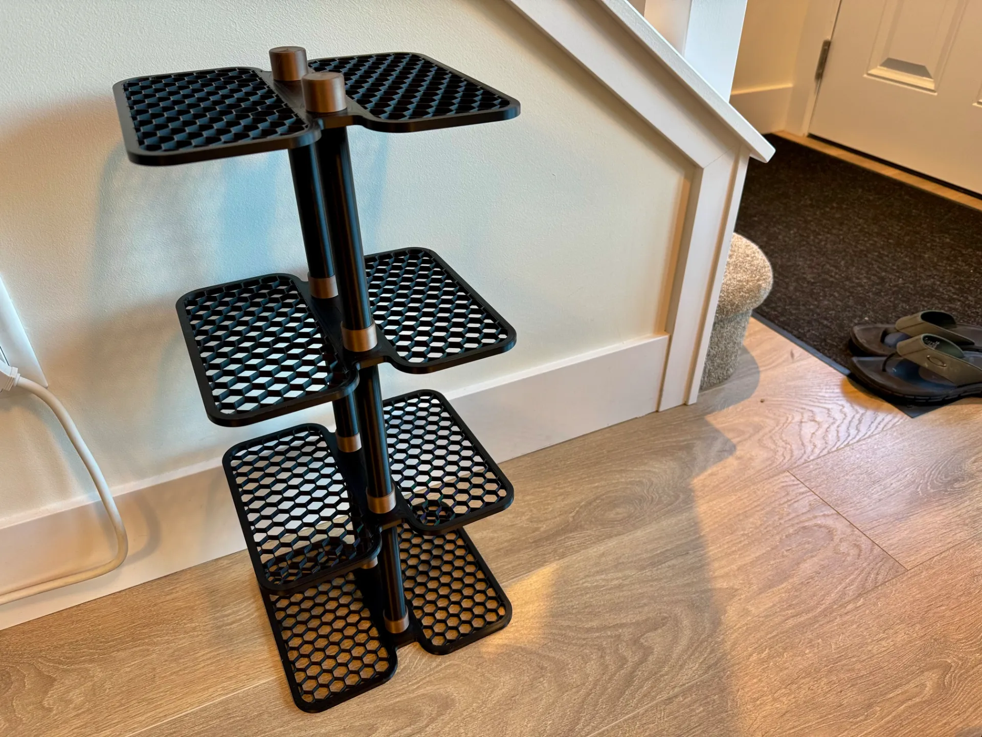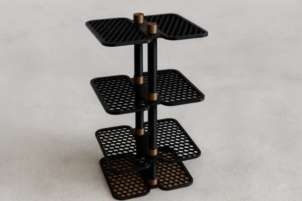 Nowoczesny stojak z półkami o strukturze plastra miodu. Idealny do łazienki, kuchni, biura lub garderoby. Połączenie stylowego designu z praktycznym przechowywaniem. Liczbę poziomów możesz łatwo dostosować do swoich potrzeb — wystarczy dodać lub usunąć segmenty. Stojak rośnie razem z Twoim zbiorem obuwia – od 2 do wielu poziomów, pełna swoboda konfiguracji.