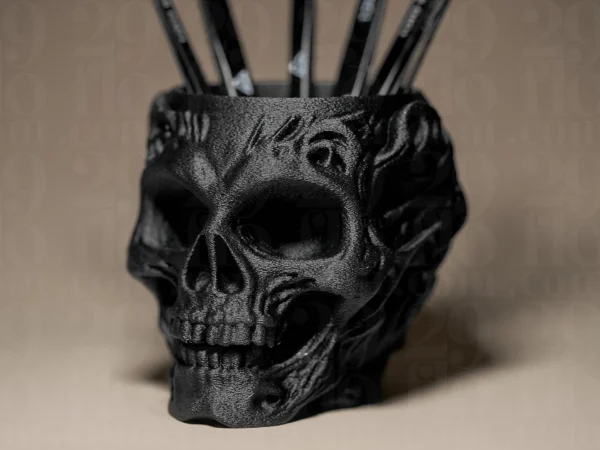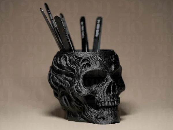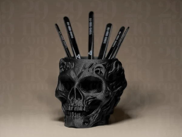 Wykonany z wysokiej jakości tworzywa sztucznego (PLA), pojemnik jest trwały, lekki i odporny na codzienne użytkowanie. Matowe wykończenie oraz precyzyjne detale czaszki przyciągają wzrok i sprawiają, że organizer staje się nie tylko praktycznym elementem biurka, ale także ozdobą wnętrza w stylu industrialnym, gotyckim lub nowoczesnym.